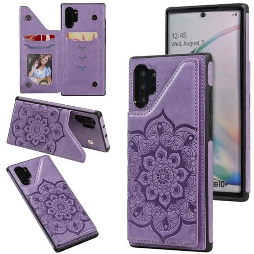 Estuche protector para Samsung Galaxy Note 10 Pro con patrón en relieve, soporte, ranuras para tarjetas y marco de fotos (Púrpura)