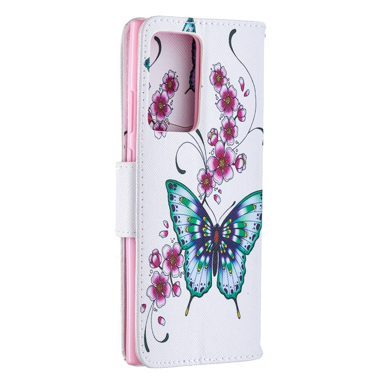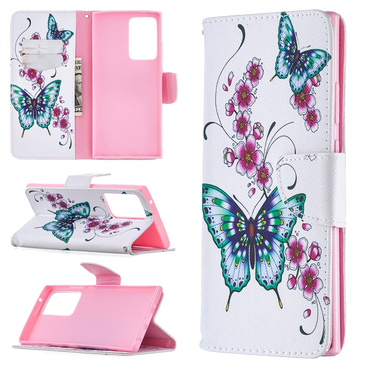 Estuche de Cuero abatible Samsung Galaxy Note20 con Patrón de Dibujo, Soporte, Ranuras para Tarjetas y Billetera (Flor de Durazno y Mariposa)