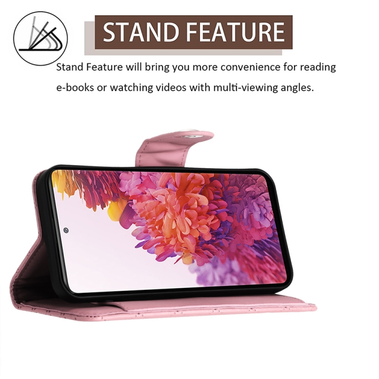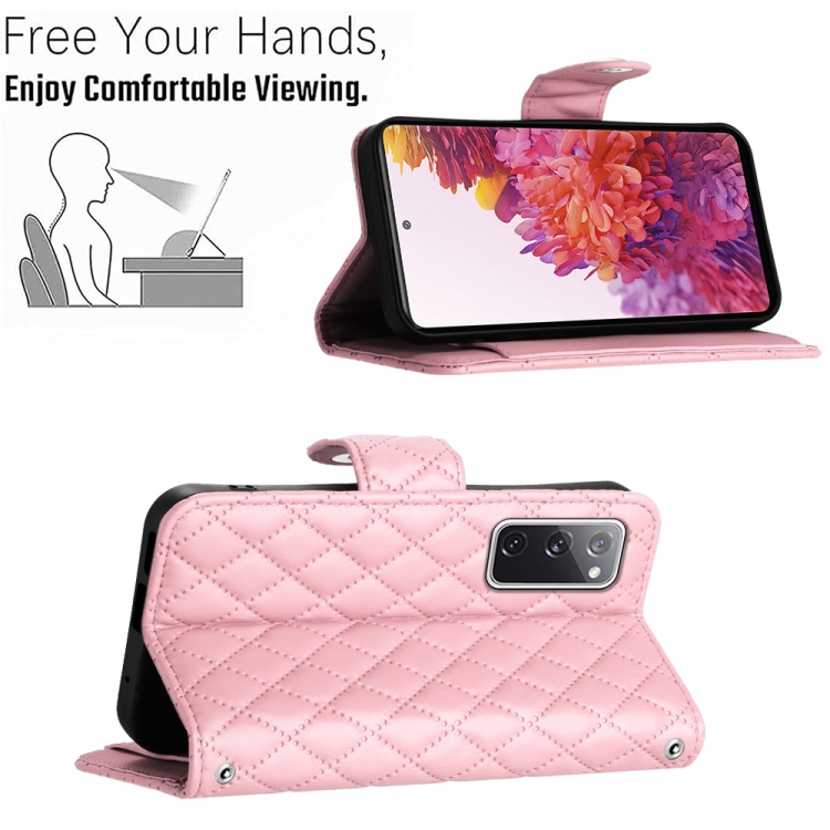 Funda para Teléfono Samsung Galaxy S20 FE con Tapa de Cuero Textura Rómbica y Cordón Largo (Rosa)