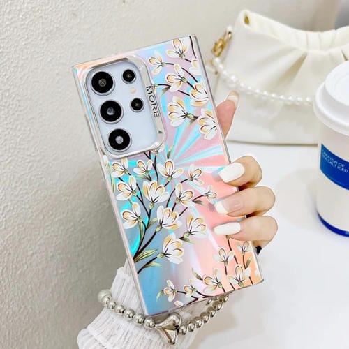 Estuche para teléfono Samsung Galaxy S24 Ultra 5G con flor láser galvanizada y correa para la muñeca (Pear Blossom Ah17)