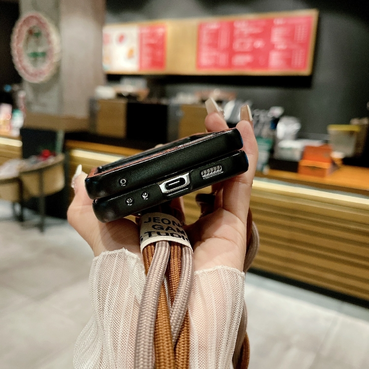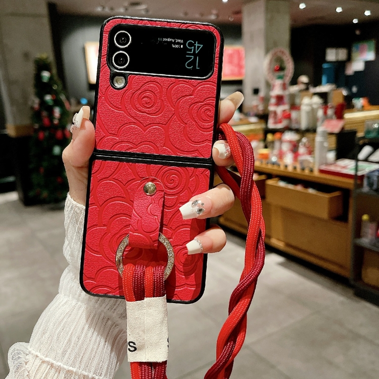 Funda Protectora Samsung Galaxy Z Flip3 5G con Patrón de Camelia y Cordón Largo con Anillo de Diamante (Rojo)