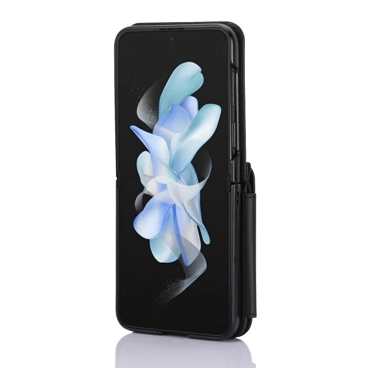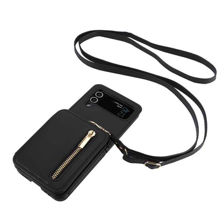 Estuche plegable para teléfono Samsung Galaxy Z Flip3 con ranuras para tarjetas y cremallera Rfid con cordón largo (Negro)