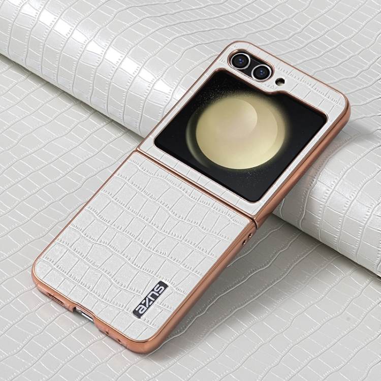 Estuche para Teléfono Samsung Galaxy Z Flip5 Azns Textura de Cocodrilo con Marco Galvanizado (Blanco)