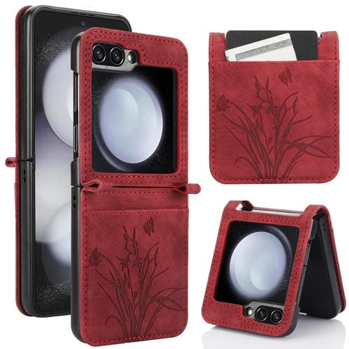 Funda para Teléfono Samsung Galaxy Z Flip5 Cuero Relieve Mariposa Orquídea (Rojo)