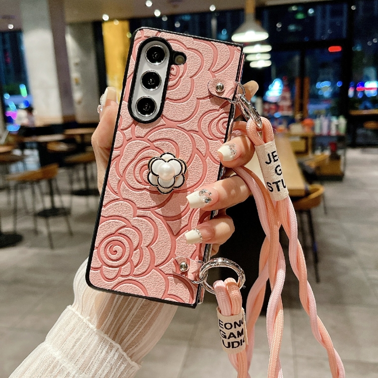 Funda Protectora para Samsung Galaxy Z Fold3 5G con Patrón de Camelia y Cordón Largo (Rosa)