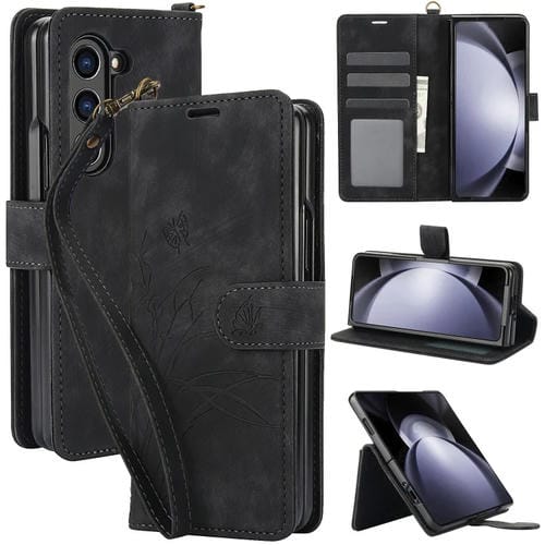 Funda para Teléfono Samsung Galaxy Z Fold5 Cuero Relieve Mariposa Orquídea (Negro)