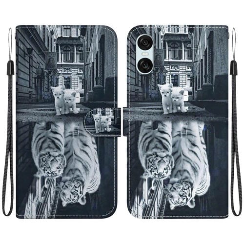 Estuche para Sony Xperia 5 Vi de Cuero con Dibujo Coloreado y Textura de Cristal (Reflejo de Tigre Gato)