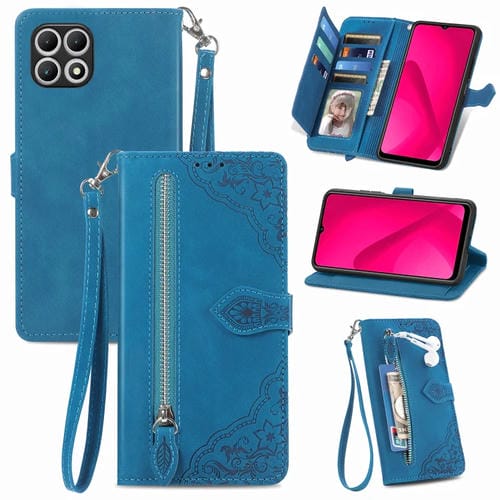 Funda de Cuero para T-Mobile Revvl 7 Pro 5G con Cremallera y Flor en Relieve (Azul)