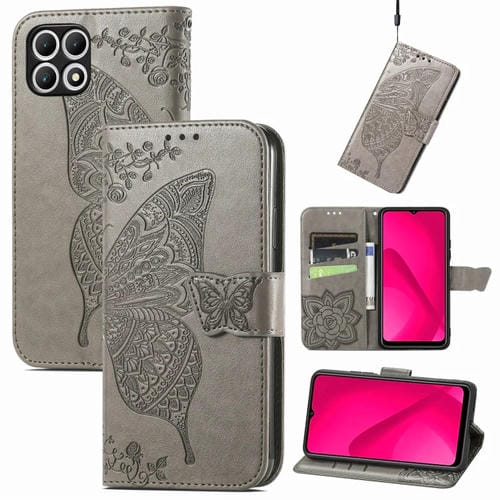 Funda para T-Mobile T Phone 2 5G de Cuero con Relieve Flor y Mariposa (Gris)