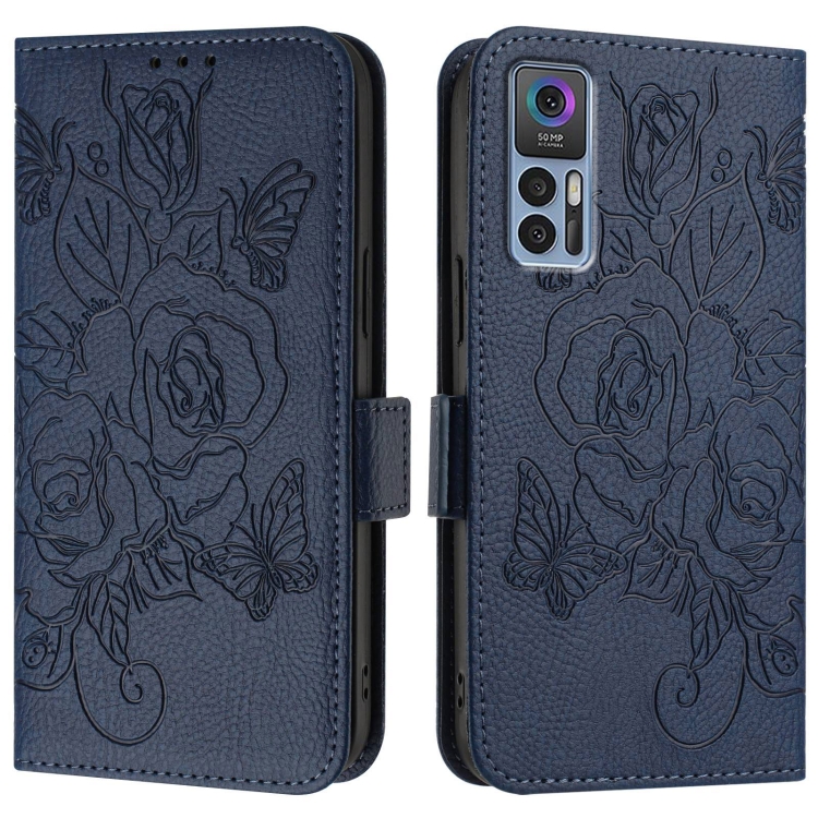 Funda para TCL 30 5G / 4G / 30+ Cuero Antirrobo RFID con Rosa En Relieve (Azul Oscuro)