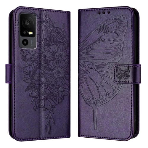 Funda de Cuero para TCL 40 R 5G con Mariposa en Relieve (Púrpura Oscuro)