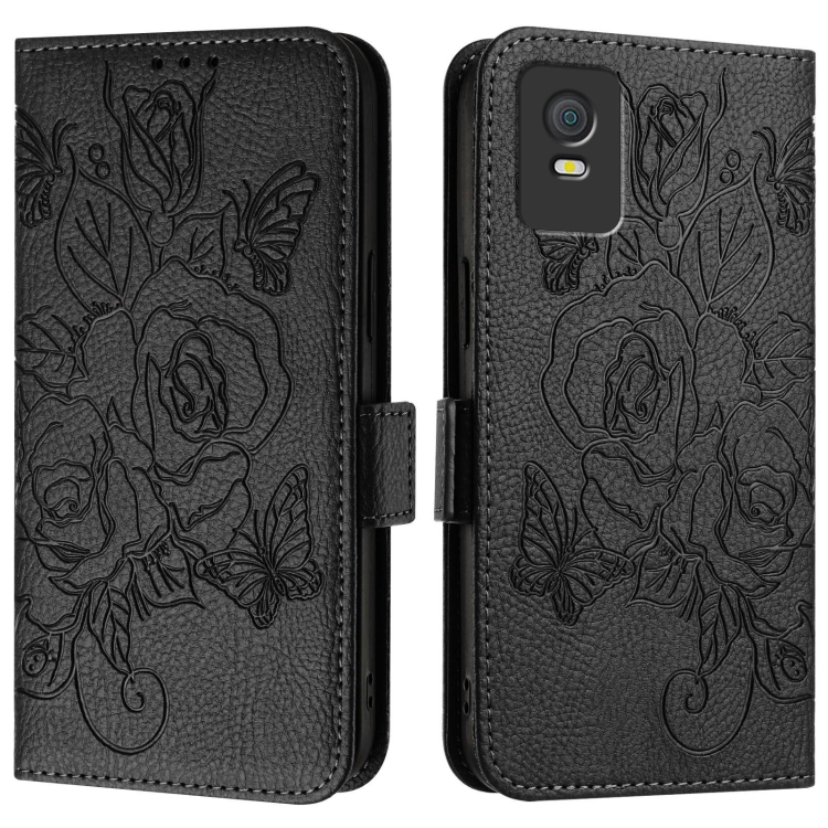 Funda de Cuero Antirrobo RFID para TCL 403 con Rosa en Relieve (Negro)