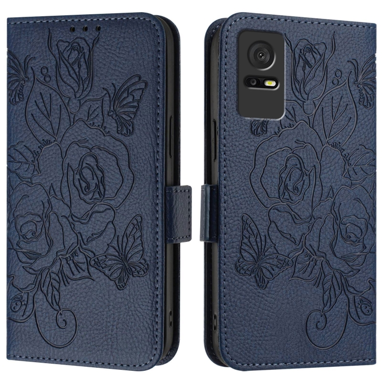 Funda de Cuero Antirrobo RFID para TCL 405/406/408 con Rosa en Relieve (Azul Oscuro)