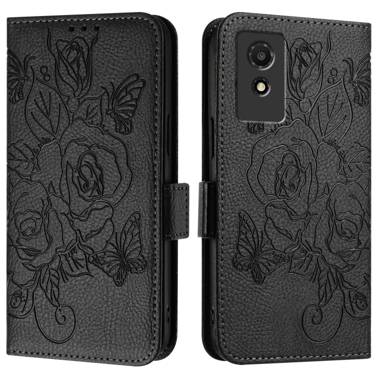 Funda de Cuero Antirrobo RFID para TCL 501 con Rosa en Relieve (Negro)