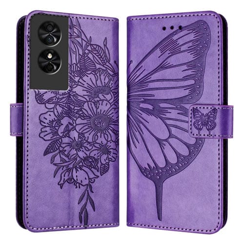 Funda de Cuero para TCL 505 Se con Mariposa en Relieve (Púrpura Claro)