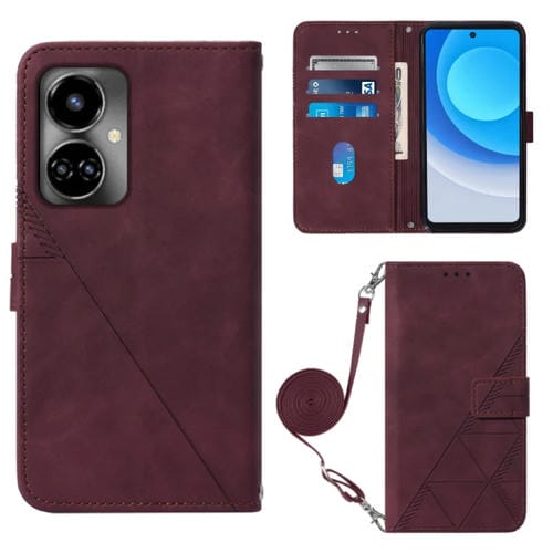Funda de Cuero con Tapa para Tecno Camon 19 Crossbody 3D en Relieve (Rojo Vino)