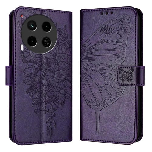 Funda de Cuero para Tecno Camon 30 4G y 5G con Mariposa en Relieve (Púrpura Oscuro)