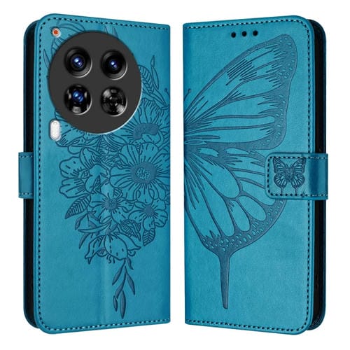 Funda de Cuero para Tecno Camon 30 Premier 5G con Mariposa en Relieve (Azul)