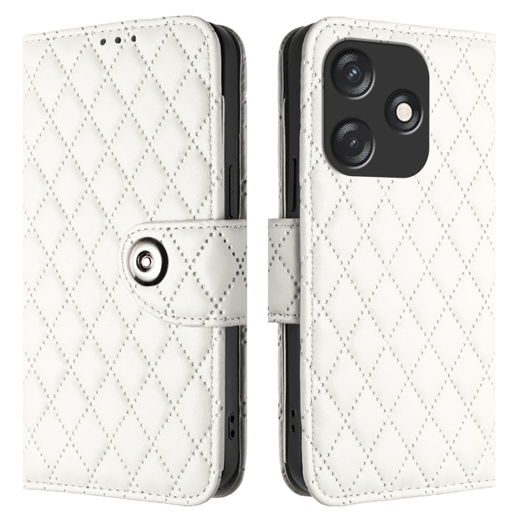 Funda de Cuero para Tecno Spark 10C con Tapa Textura Romboidal y Cordón (Blanco)