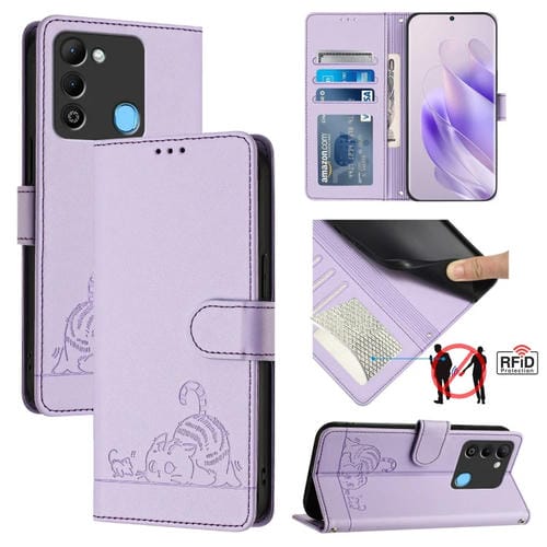 Funda para Tecno Spark 9 Cat Rat Cuero Rfid con Patrón en Relieve y Cordón (Púrpura)