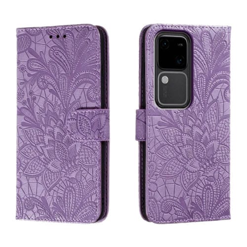 Para Vivo S18 Funda de Cuero con Tapa y Estampado de Flores de Encaje (Púrpura)