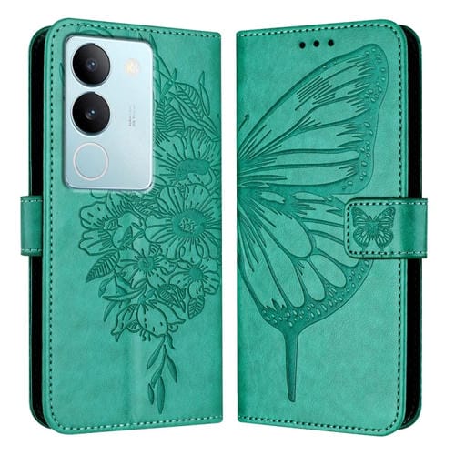 Para Vivo V29 5G Global / V29 Pro Funda de Cuero para Teléfono con Mariposa En Relieve (Verde)