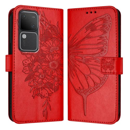 Para Vivo V30 5G / V30 Pro 5G Funda para Teléfono de Cuero con Mariposa En Relieve Global (Rojo)