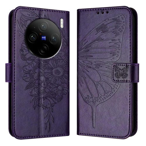 Para Vivo X100S 5G Funda de Cuero con Mariposa En Relieve (Púrpura Oscuro)