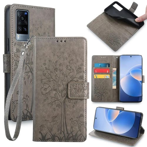 Para Vivo X60 Funda para Teléfono de Cuero con Relieve de Árbol y Ciervo (Gris)