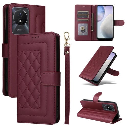Para Vivo Y02 Diamond Lattice Funda de Cuero para Teléfono con Tapa (Rojo Vino)