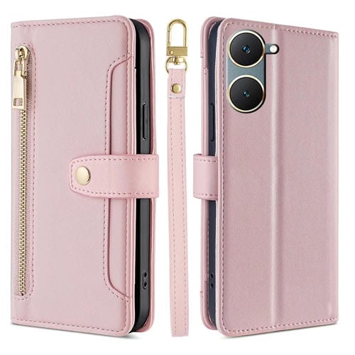 Para Vivo Y03 4G Funda de Cuero para Teléfono con Billetera con Cremallera y Cuerpo Cruzado con Textura de Oveja (Rosa)