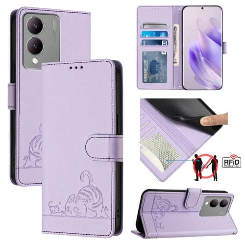 Para Vivo Y17S 4G Global Cat Rat Estuche para Teléfono de Cuero Rfid con Patrón En Relieve y Cordón (Púrpura)