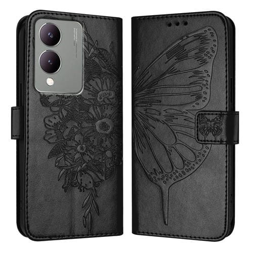 Para Vivo Y17S 4G Global / Y28 5G India Funda para Teléfono de Cuero con Mariposa En Relieve (Negro)