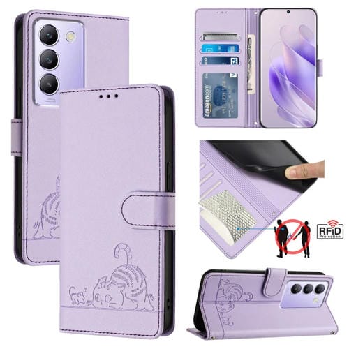 Para Vivo Y200E 5G Global Cat Rat Estuche para Teléfono de Cuero Rfid con Patrón En Relieve y Cordón (Púrpura)