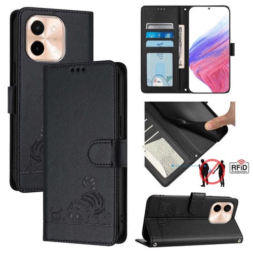 Para Vivo Y28 4G Cat Rat Estuche para Teléfono de Cuero Rfid con Patrón En Relieve y Cordón (Negro)