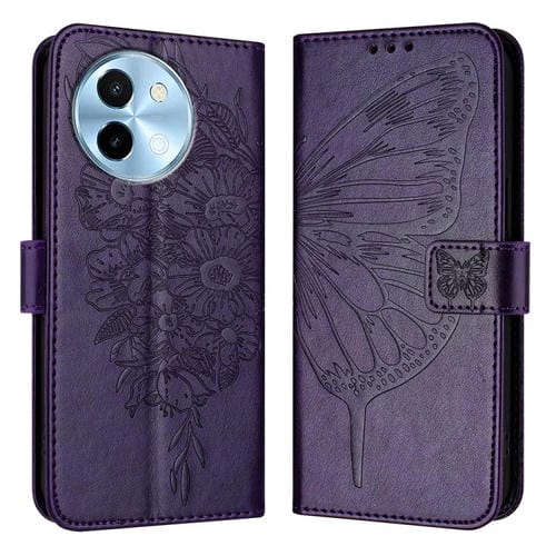 Para Vivo Y38 5G Funda de Cuero con Mariposa En Relieve (Púrpura Oscuro)