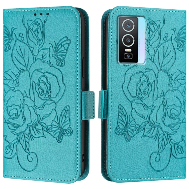 Para Vivo Y76 5G Funda para Teléfono de Cuero Antirrobo Rfid con Rosa En Relieve (Azul Claro)