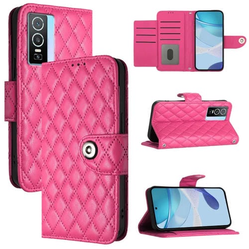 Para Vivo Y76 5G Funda para Teléfono de Cuero con Tapa con Textura Rómbica y Cordón (Rojo Rosa)