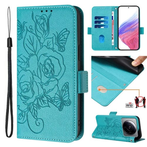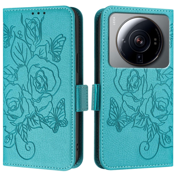 Para Xiaomi 12S Ultra Embossed Rose Rfid Funda de Cuero Antirrobo para Teléfono (Azul Claro)
