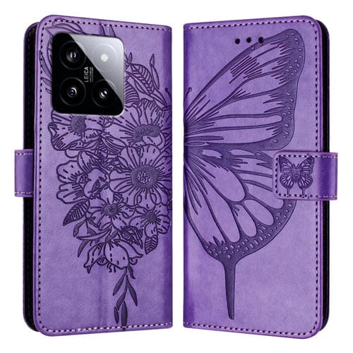 Para Xiaomi 14 5G Funda De Teléfono De Cuero Con Mariposa En Relieve Global (Púrpura)