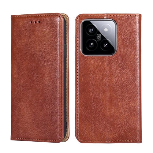 Para Xiaomi 14 Estuche De Teléfono De Cuero Magnético De Color Sólido Con Aceite Brillante (Marrón)