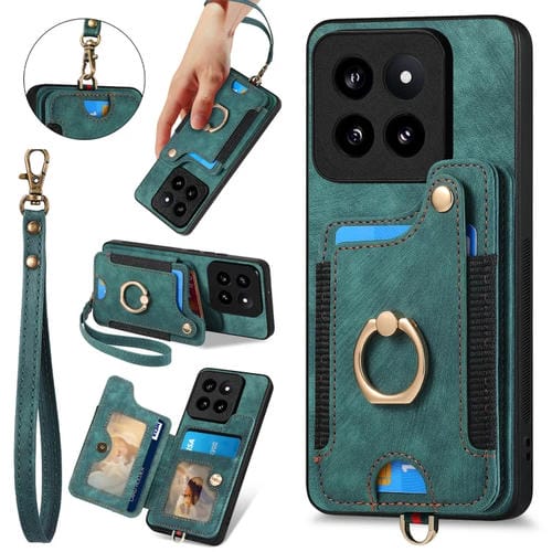 Para Xiaomi 14 Pro Retro Skin-Feel Ring Funda Para Teléfono Con Billetera Rfid Con Múltiples Tarjetas (Verde)