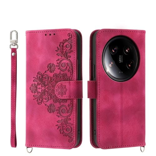 Para Xiaomi 14 Ultra Skin-Feel Flowers Funda De Cuero Con Billetera En Relieve Para Teléfono (Rojo Vino)