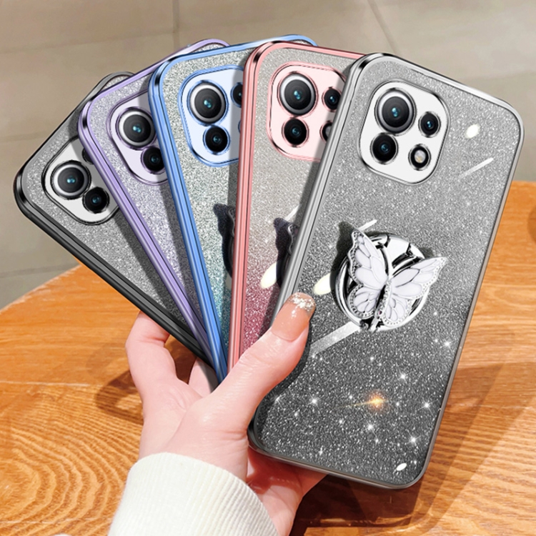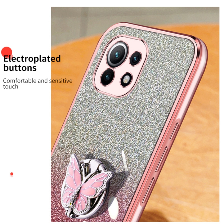 Para Xiaomi Mi 11 Funda para Teléfono de TPU con Soporte de Mariposa con Brillo Degradado Plateado (Azul Sierra)
