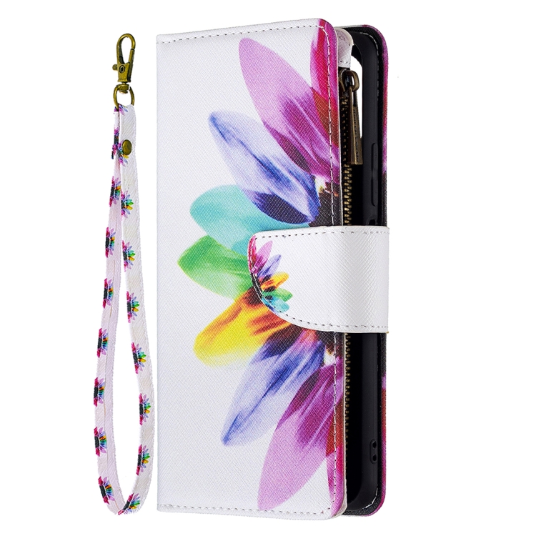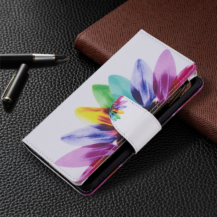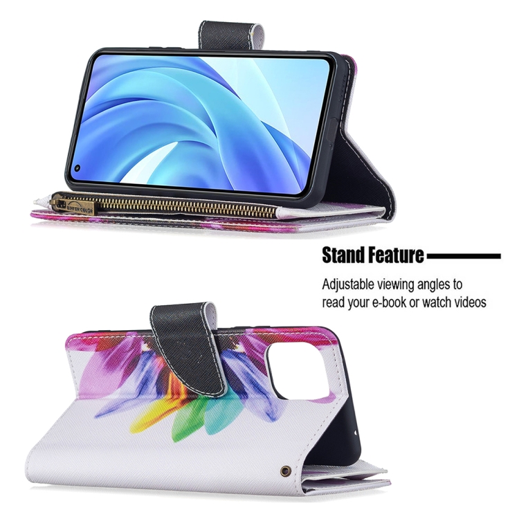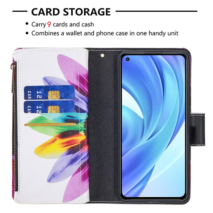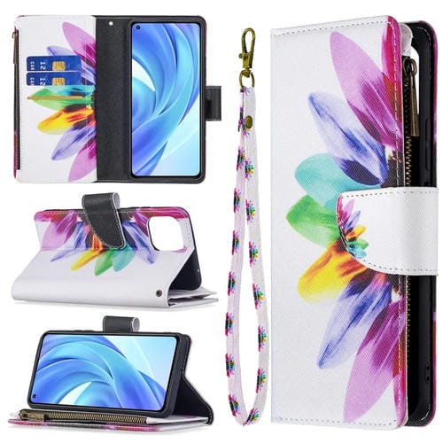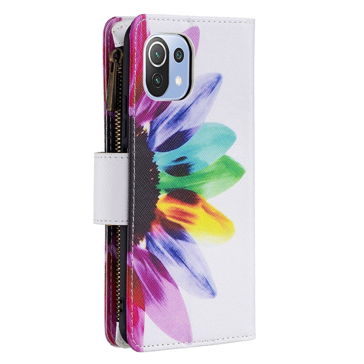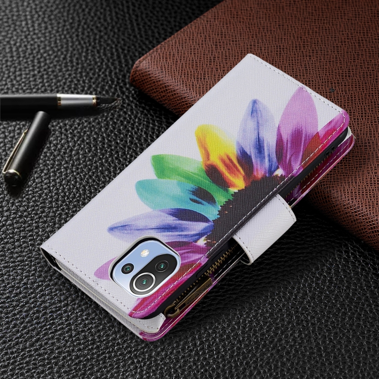 Para Xiaomi Mi 11 Lite Patrón de Dibujo de Color Cremallera con Cremallera de Cuero Horizontal Flip Funda con Soporte y Ranuras para Tarjeta y Billetera (Flor de Sol)