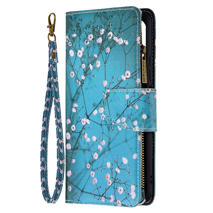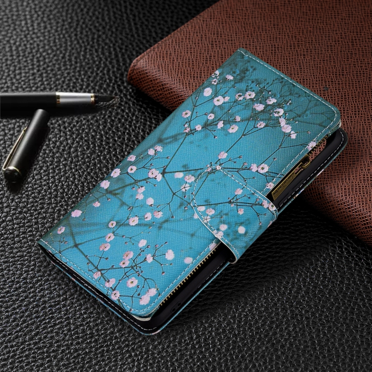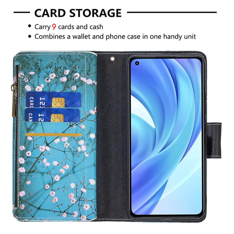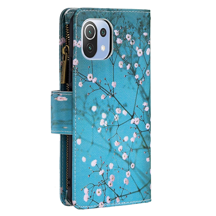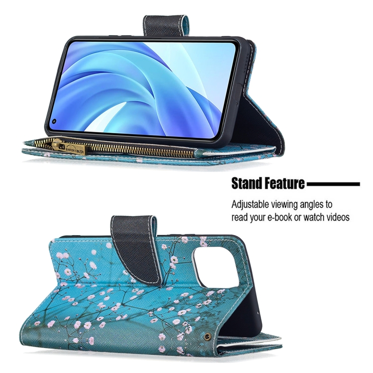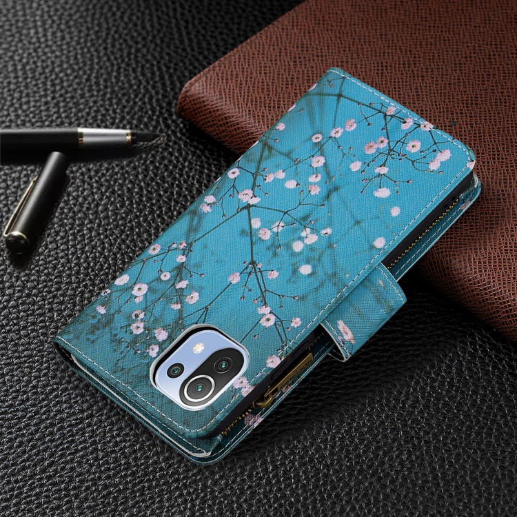 Para Xiaomi Mi 11 Lite Patrón de Dibujo de Color Cremallera con Cremallera de Cuero Horizontal Flip Funda con Soporte y Tragamonedas y Billetera (Flor de Ciruela)