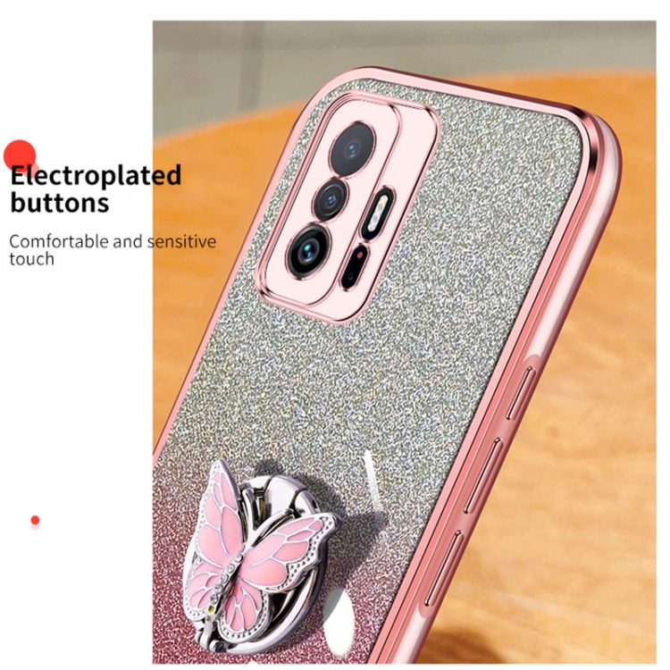 Para Xiaomi Mi 11T Funda para Teléfono de TPU con Soporte de Mariposa con Brillo Degradado Plateado (Plata)