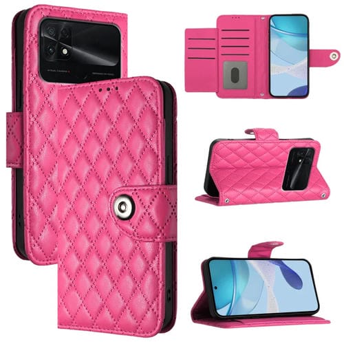 Para Xiaomi Poco C40 Funda para Teléfono de Cuero con Tapa con Textura Rómbica y Cordón (Rojo Rosa)