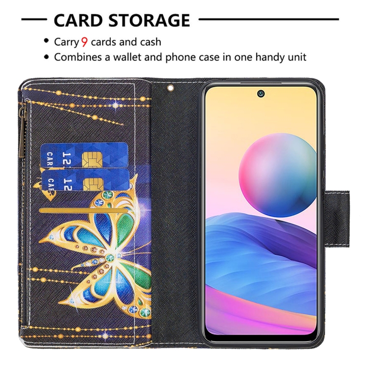 Para Xiaomi Poco M3 Pro / Redmi Note 10 5G Coloreado de Dibujo de Dibujo con Cremallera Funda de Cuero con Soporte y Ranuras para Tarjetas y Cartera (Mariposa Grande)
