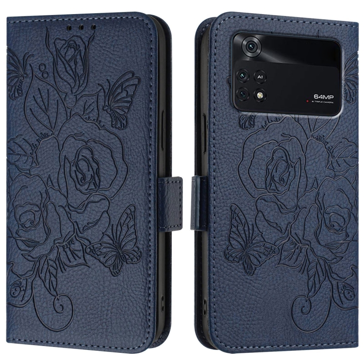 Para Xiaomi Poco M4 Pro 4G Funda de Teléfono de Cuero Antirrobo Rfid con Relieve Rosa (Azul Oscuro)